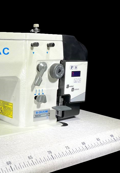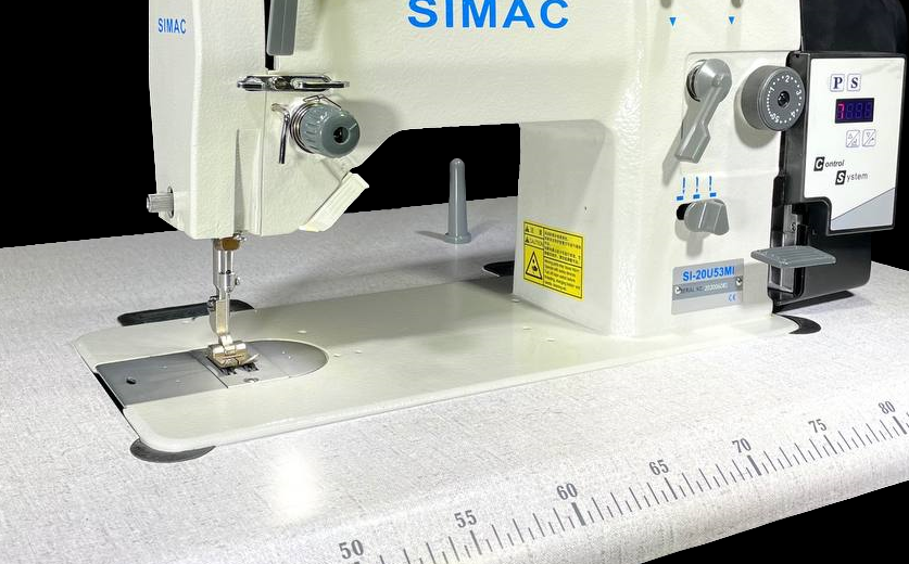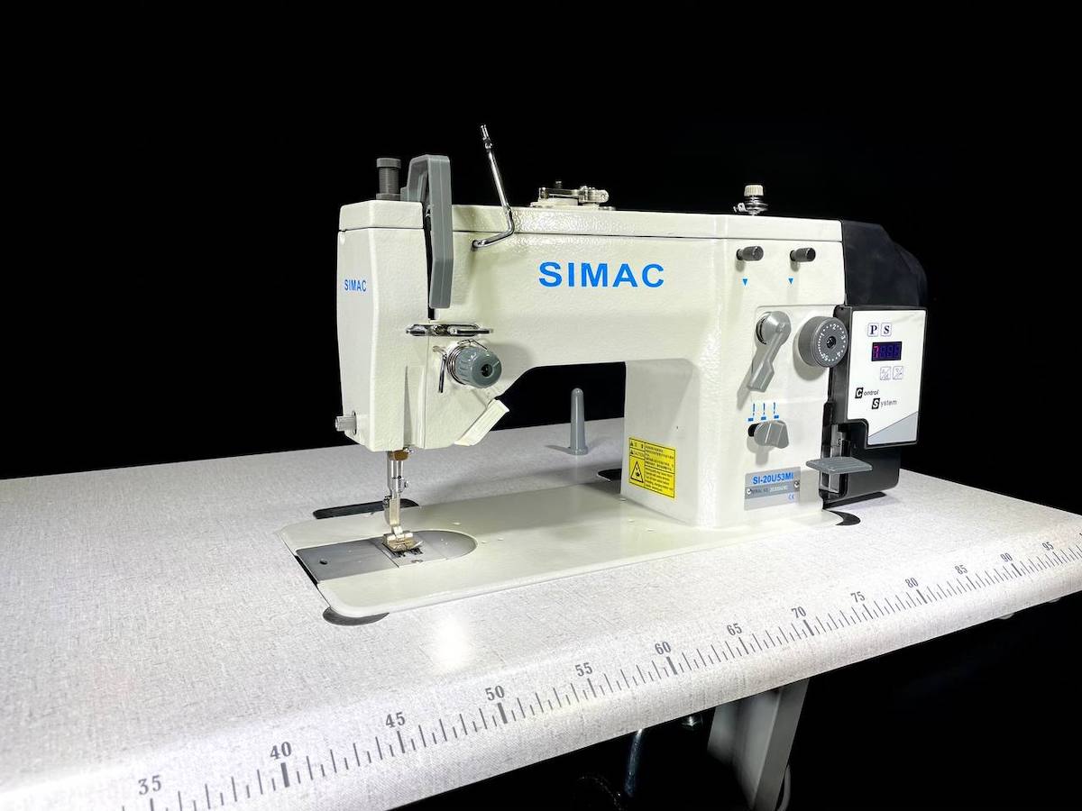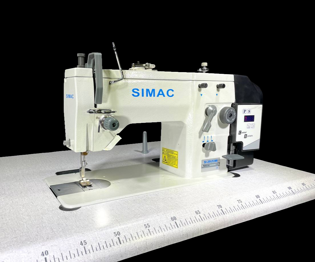 The Simac 20U MI is a Zig-Zag flatbed machine with 10 mm maximum zig-zag width and 6 mm stitch length, equipped with integrated motor, panel for speed and parameter adjustment, LED light and integrated positioner for needle position control