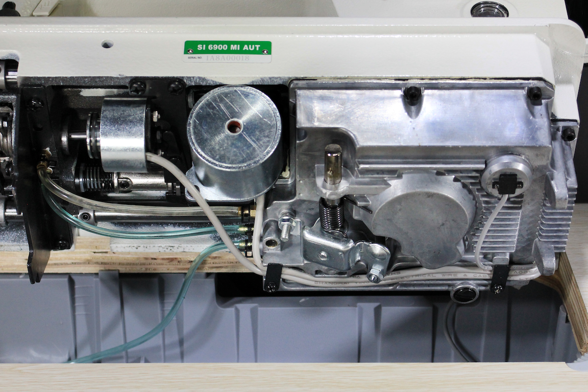 La Simac 6900 è una macchina piana ad un ago a punto annodato, con rasafilo, alzapiedino e travettatura automatica e manuale tramite leva posta a lato per la retromarcia.